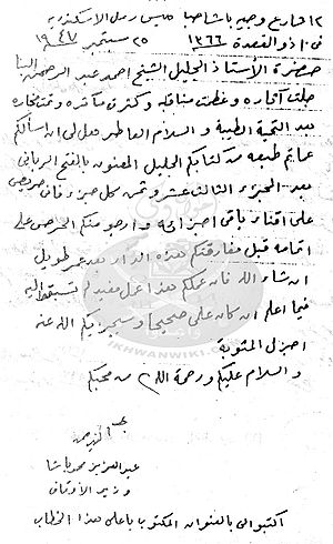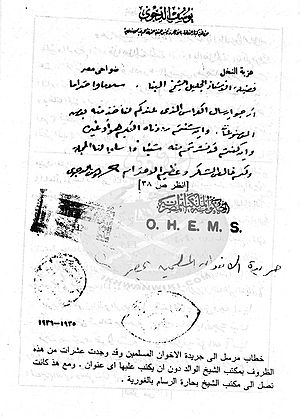 والخطاب يتسم بأدب الإمام الشهيد – رحمه الله – ويبدو أن الشيخ قد زار " الدار " – وهو عمل قلما به – ولعله لم يزر الدار إلا بعد أن أعيدت, فى الأيام الأولى لانقلاب 23 يوليو, وعزل الملك, وأم الشيخ الوالد المصلين وقتئذ...