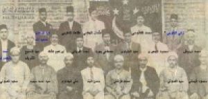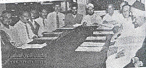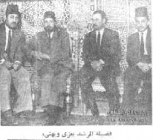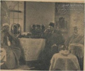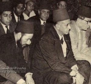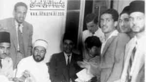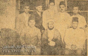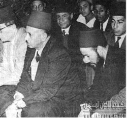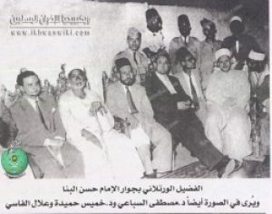 الفضيل الورتلاني بجوار الإمام حسن البنا ويُرى في الصورة أيضا د مصطفي السباعي ود خميس حميدة وعلا.